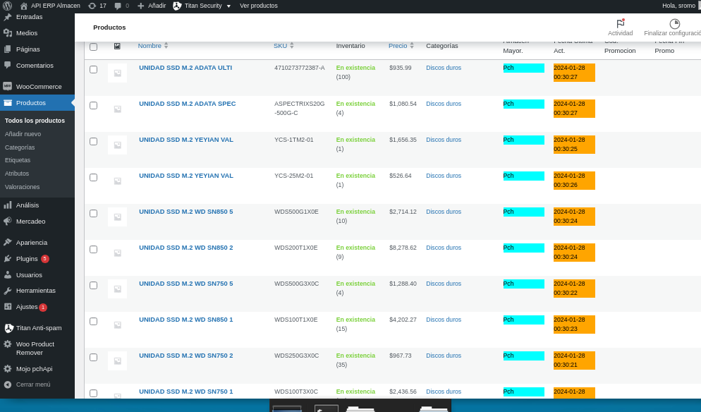Cuando haz procesado una actualizaciรณn , vas a notar que los productos quedan grabados en la tienda Woocommerce cada uno clasificado con su CATEGORIA , descripcion, Precio y existencias, PROMOCIONES,
